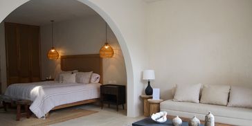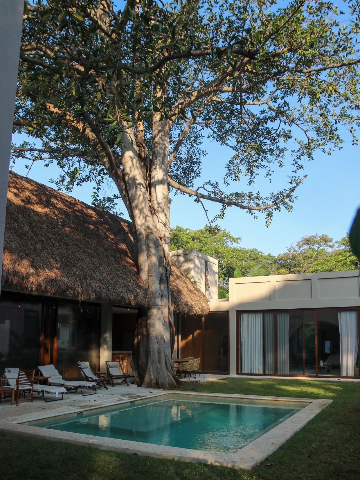 Rodeada de vegetación, junto a la cocina se aprecia la alberca privada, camas de sol y un comedor, y frente a ella la Suite Principal con cama king, sala, bañera y vistas a la naturaleza que enmarcan la experiencia