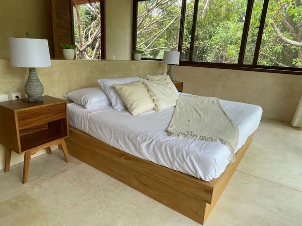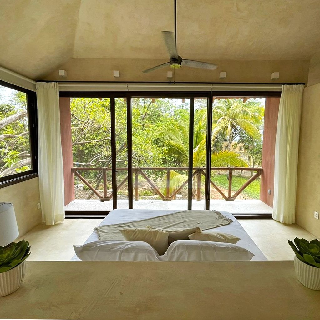 The master suite with a king size bed where you can see the beauty of the Chacalilla sea in the distance.