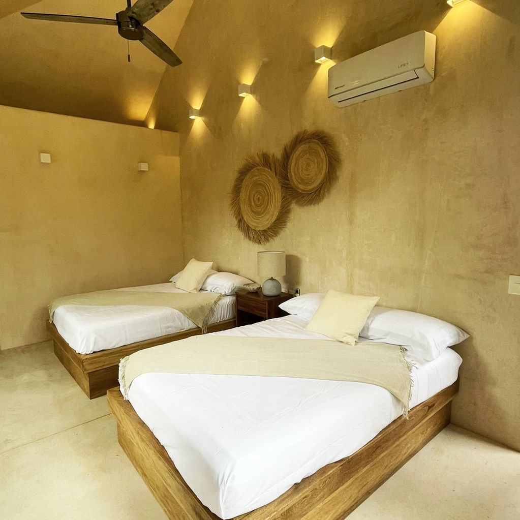 This imposing villa has 4 rooms inside, each with a private bathroom. The distribution is as follows: A main room with a king size bed where you can appreciate the beauty of the Chacalilla sea in the distance, two rooms with two double beds each and the last one with a king size bed.